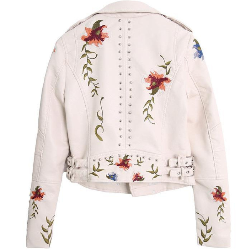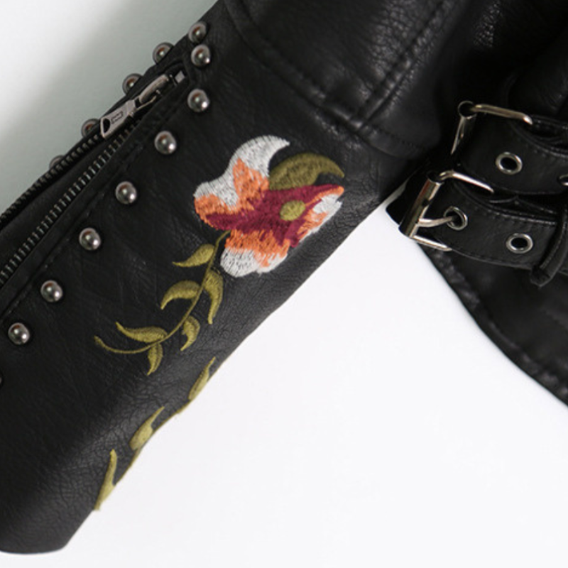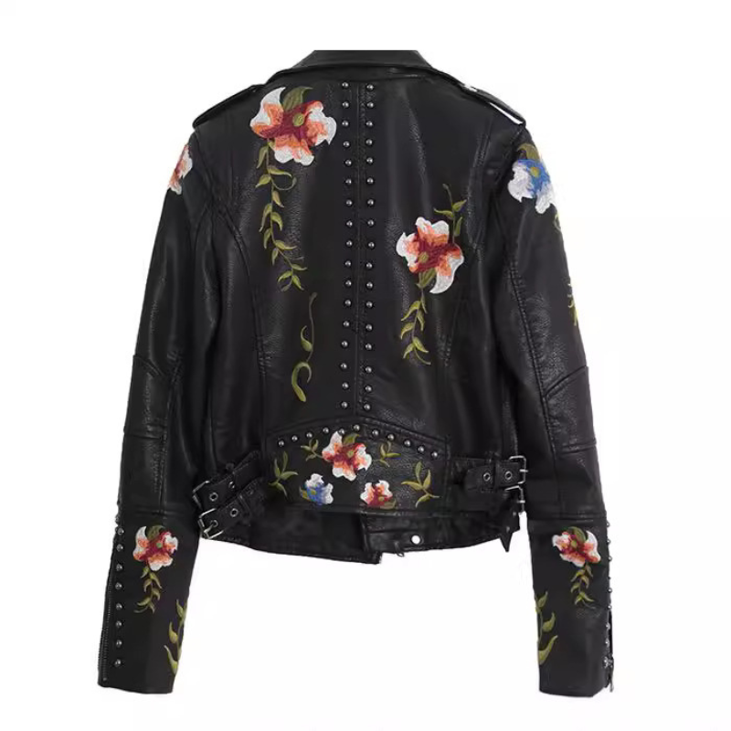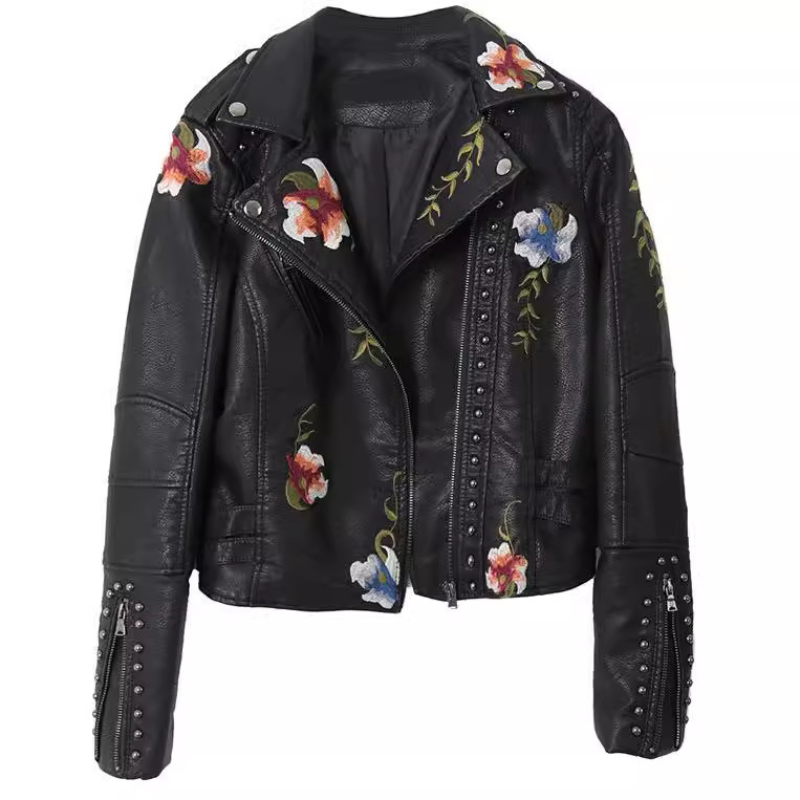 Denna zip-up jacka för kvinnor har en strukturerad silhuett med blommigt broderi över kroppen och ärmarna. Den inkluderar metallnitar längs framsidan, ärmsluten och kragen, vilket ger ett intressant design. Jackan är lämplig för användning året runt och erbjuder praktiska funktioner för olika tillfällen.